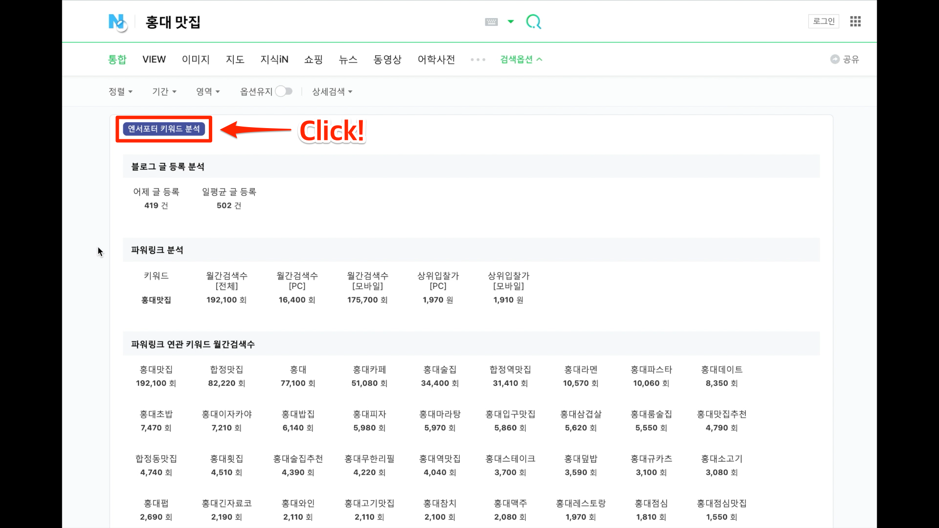 이 버튼을 클릭하면 검색한 키워드의 분석 결과가 나타납니다.